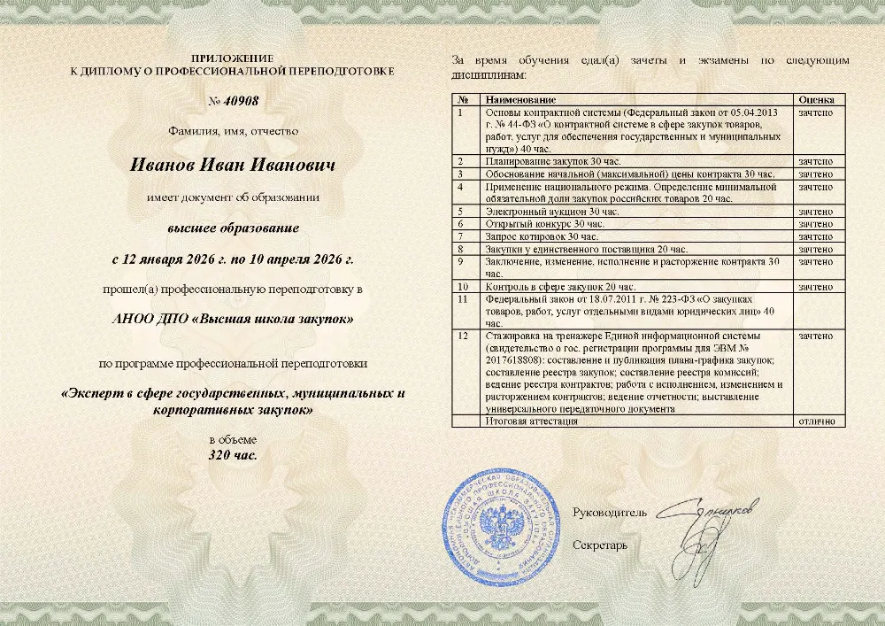 Вы получаете официальный диплом эксперта о профессиональной переподготовке. Высшая школа закупок (fz44.org) в обязательном порядке вносит сведения об обучении в Волгограде в реестр ФИС ФРДО, подтверждая ваш высший квалификационный статус.
