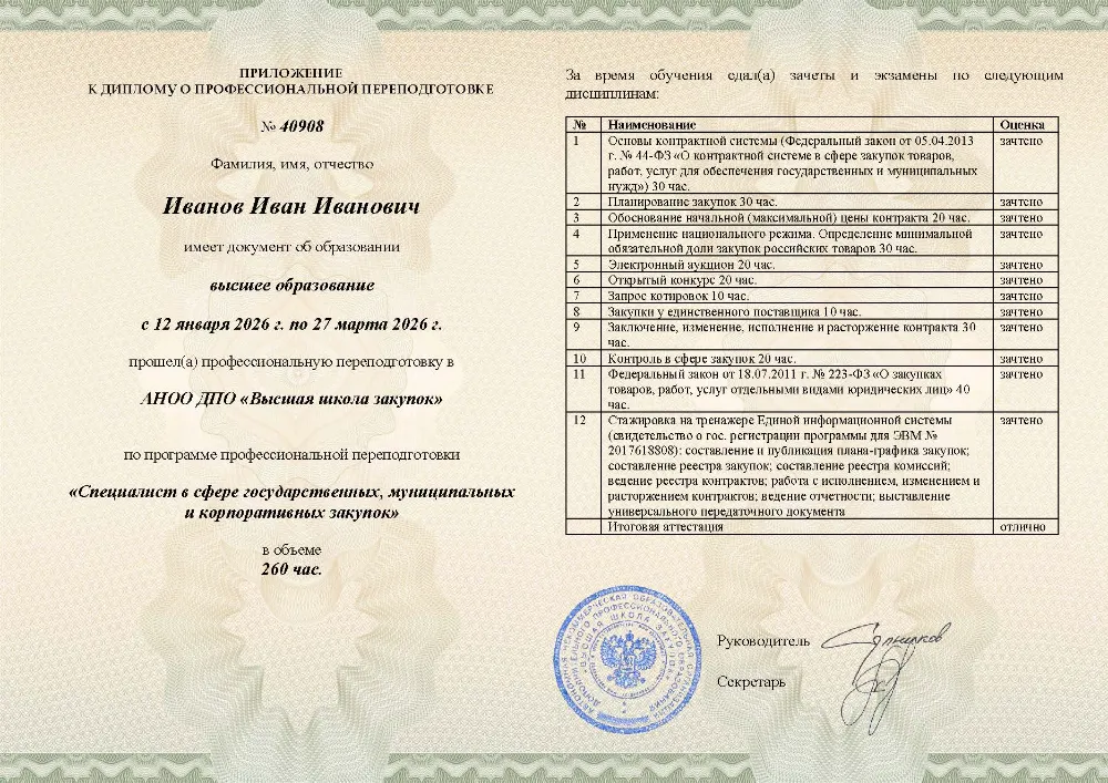 Вы получаете официальный диплом о профессиональной переподготовке. Высшая школа закупок (fz44.org) в обязательном порядке вносит сведения об обучении в Волгограде в реестр Рособрнадзора, подтверждая вашу квалификацию для госслужбы и корпораций Волгограда.